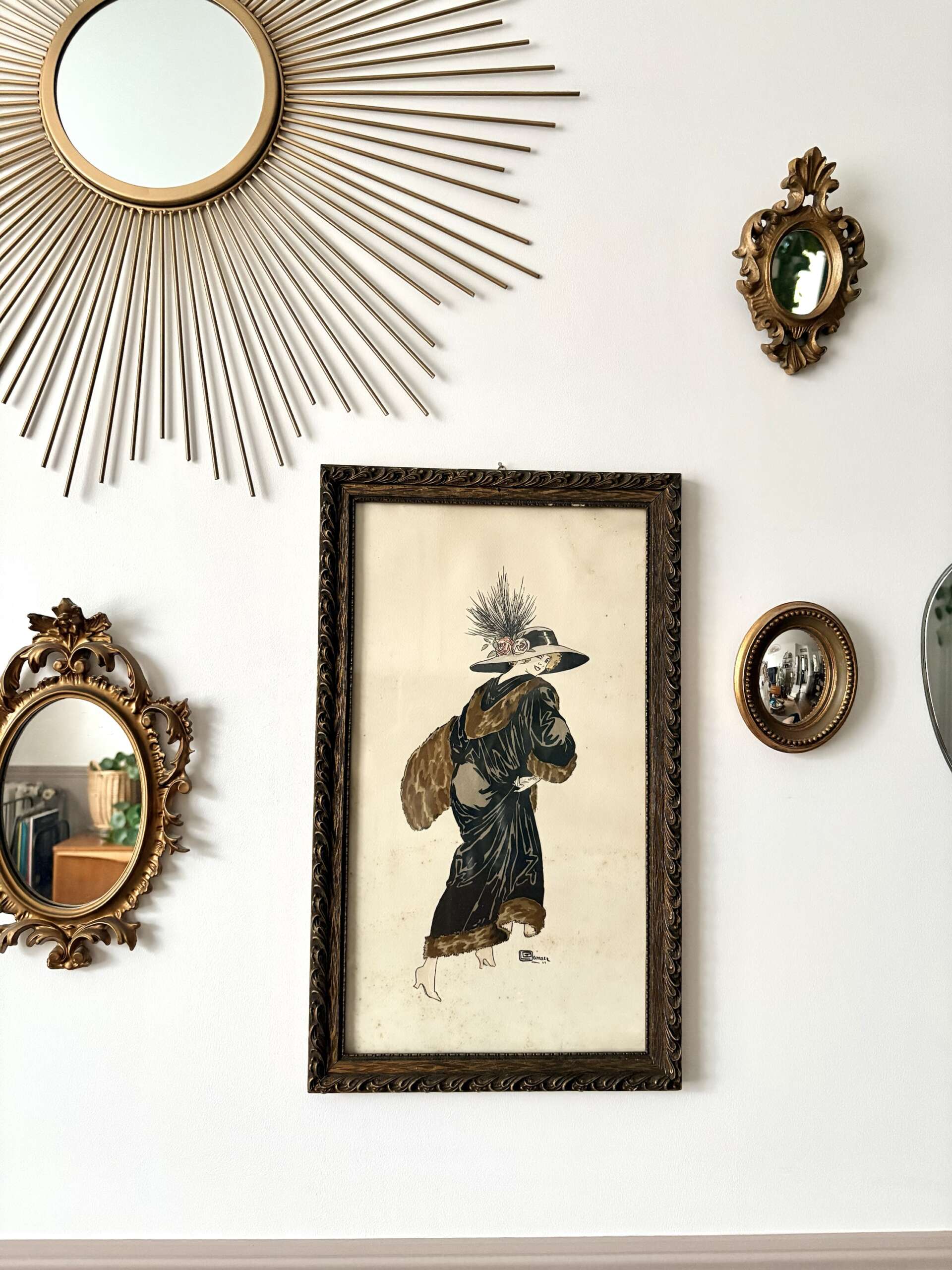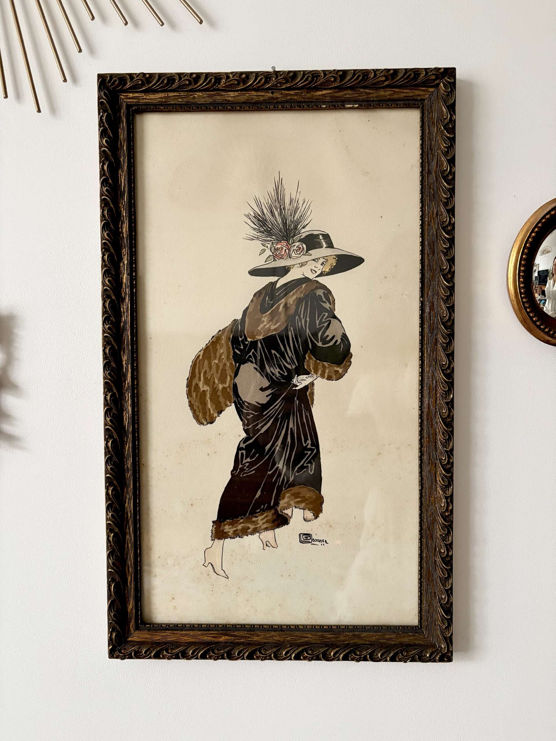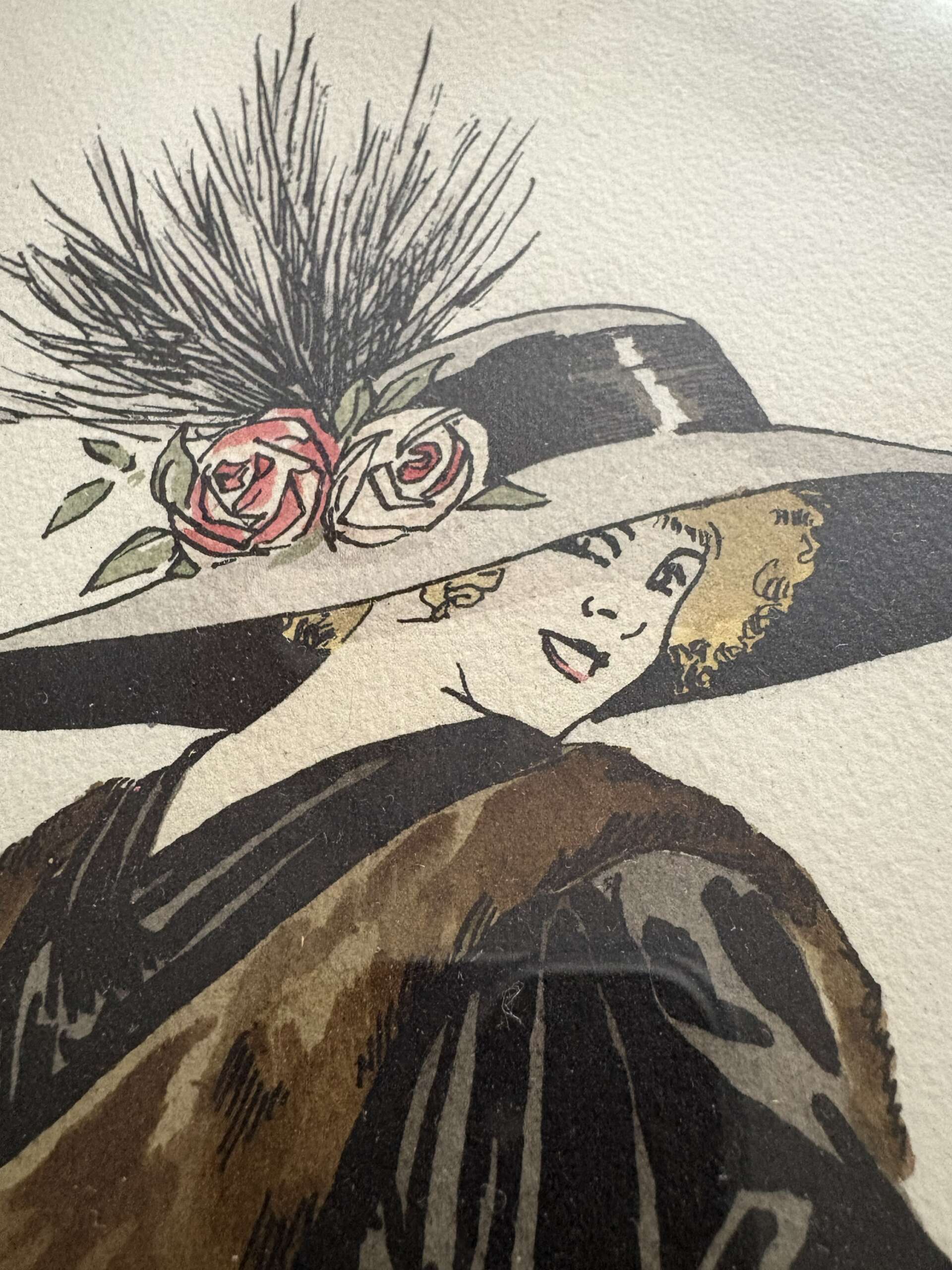 Superbe estampe lithographie Art Déco signée par Georges Léonnec (1881-1940) illustrateur de mode actif dans les années 20-30, représentant une élégante femme des années 1920, vêtue d’un manteau à effet fourrure et coiffée d’un large chapeau orné de fleurs.