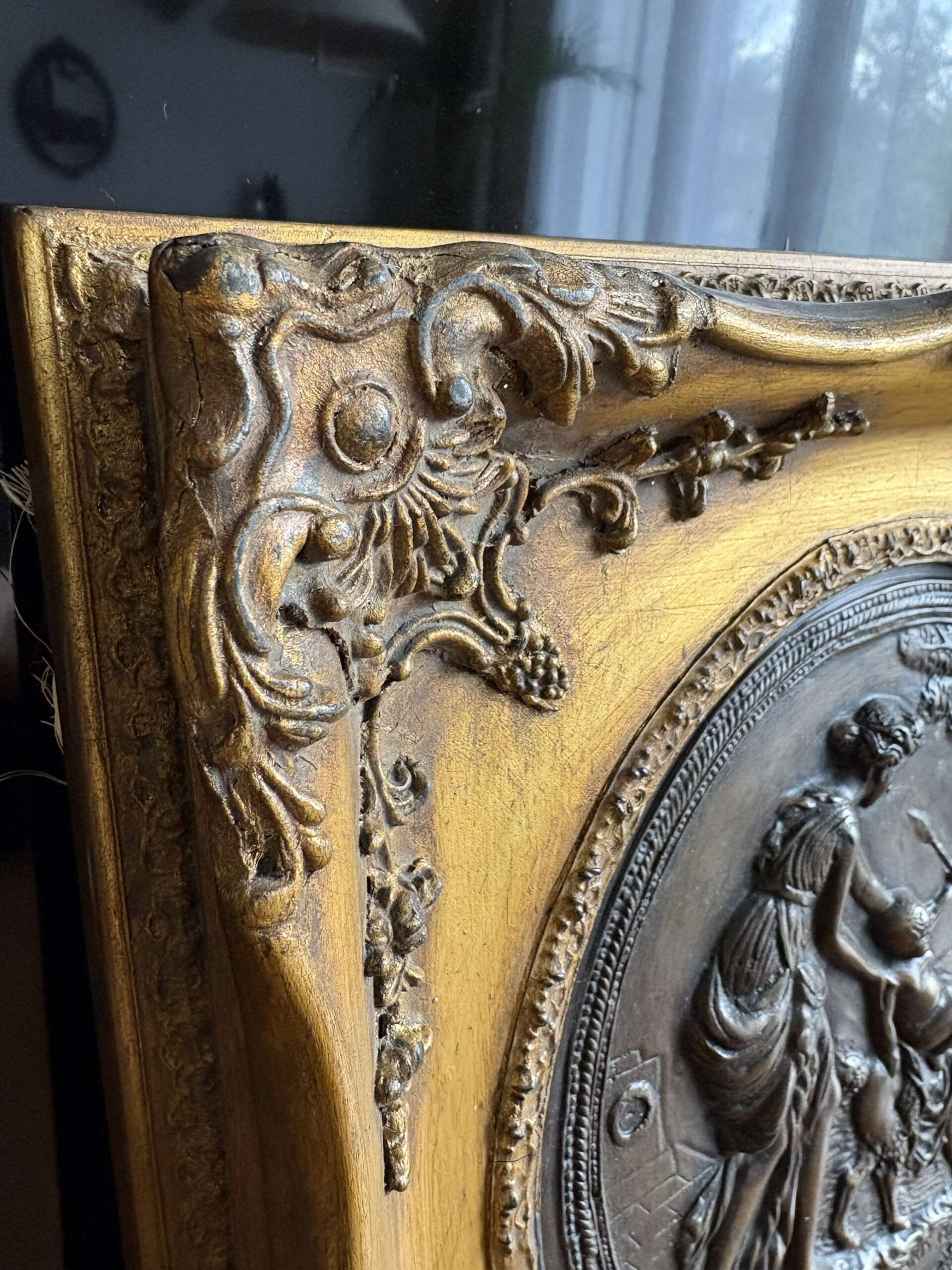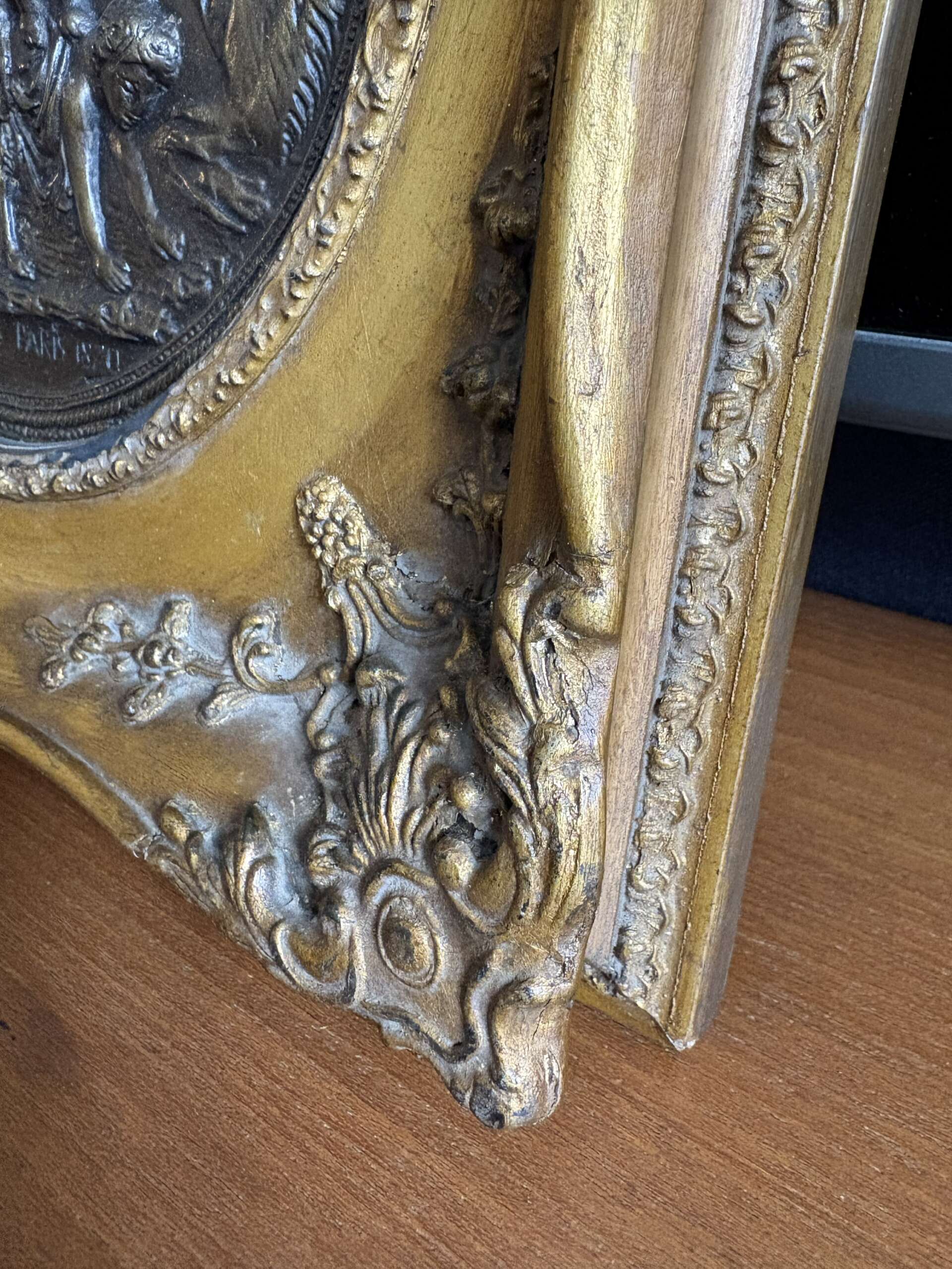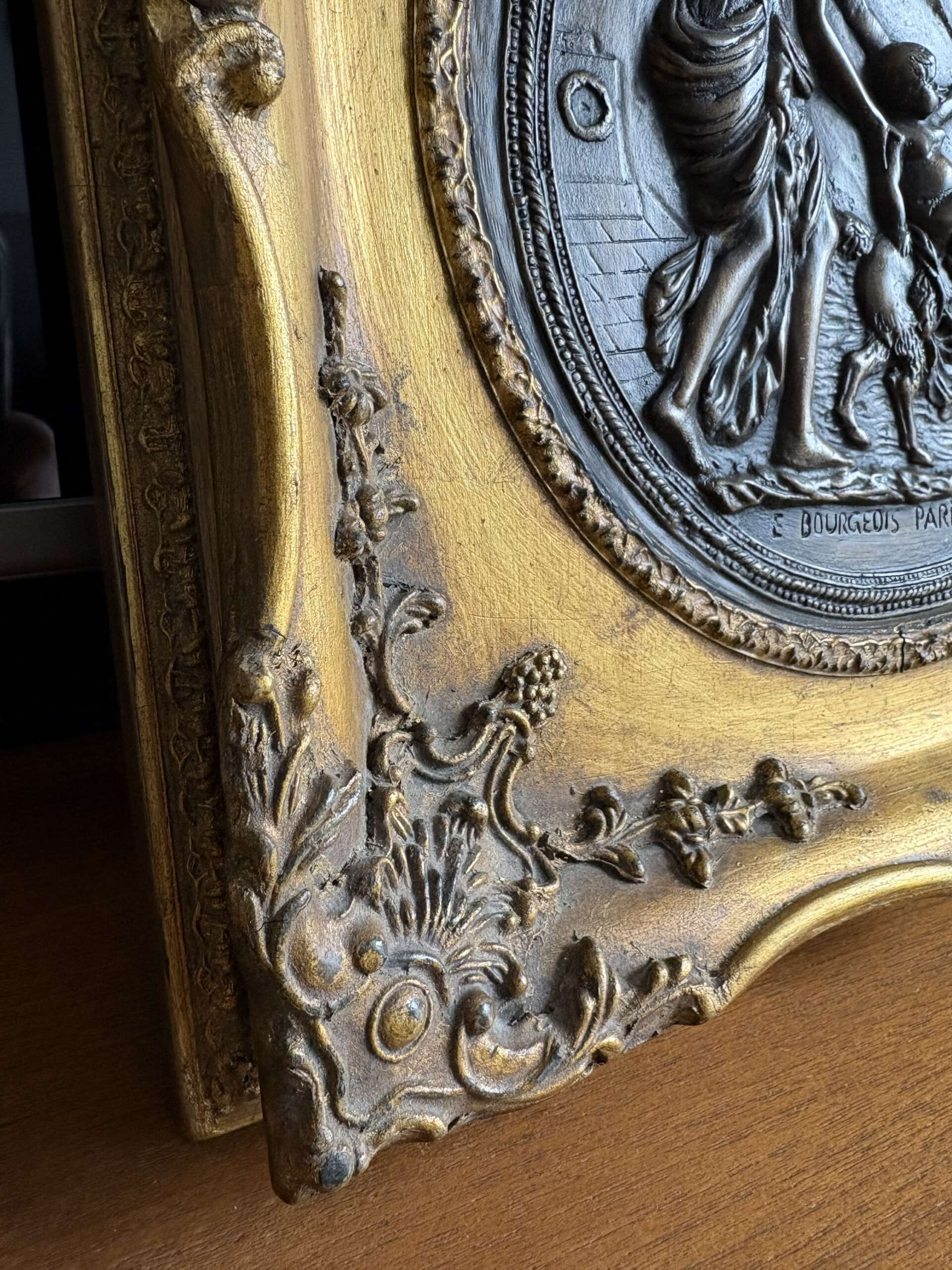 Médaillon bas relief en bronze , dans un bel encadrement en bois doré .