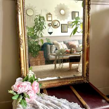Miroir très ancien présentant des sauts de plâtre à certains endroits . Le miroir a un manque de tain dans la partie en haut à gauche . Ces petits défauts lui confèrent un charme fou .
