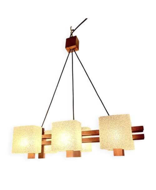Lustre suspension scandinave 6 feux en teck et perspex année 50