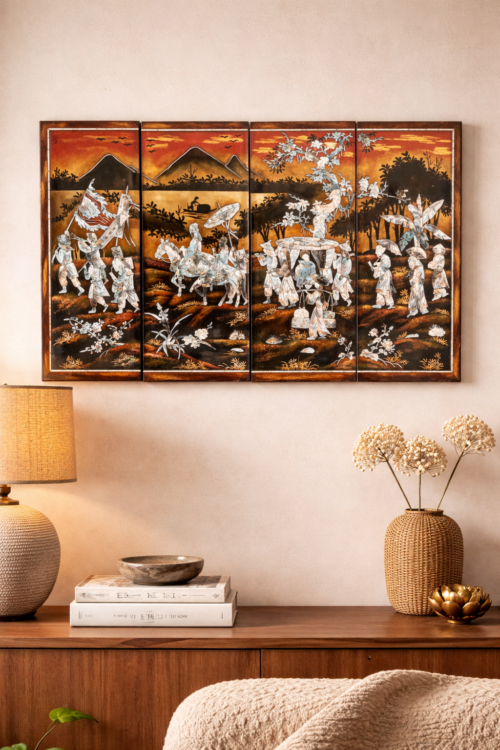 Panneaux vietnamiens anciens en laque et nacre – scène de procession – décor asiatique années 60