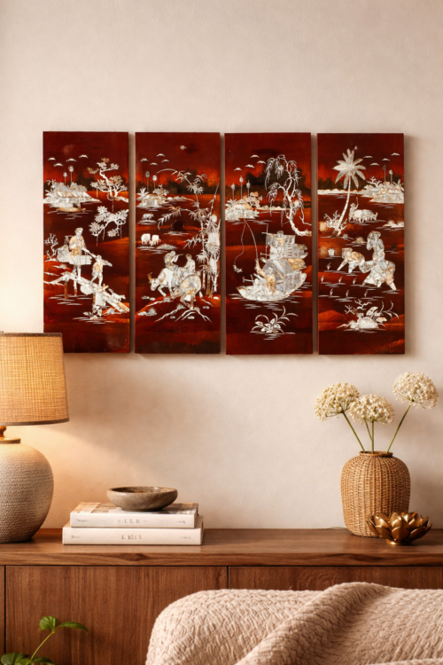Panneaux vietnamiens anciens en laque et nacre – décor des 4 saisons – art asiatique années 60